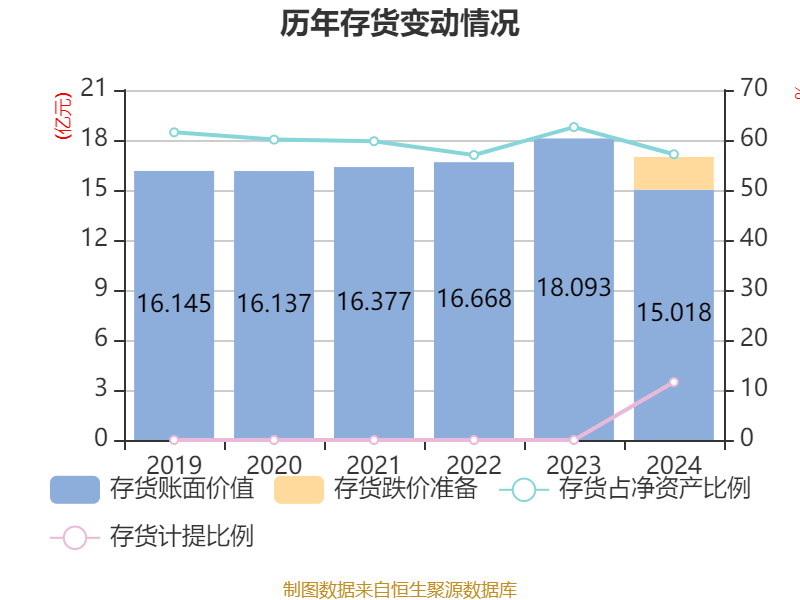 从存货变动来看,截至2024年末,公司存货账面价值为15.02亿元,占净资产的57.15%,较上年末减少3.07亿元。其中,存货跌价准备为1.97亿元,计提比例为11.58%。