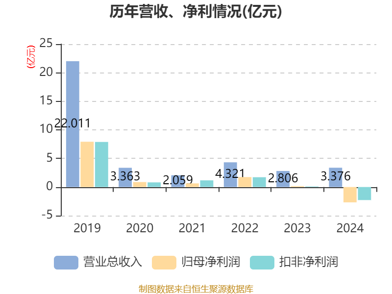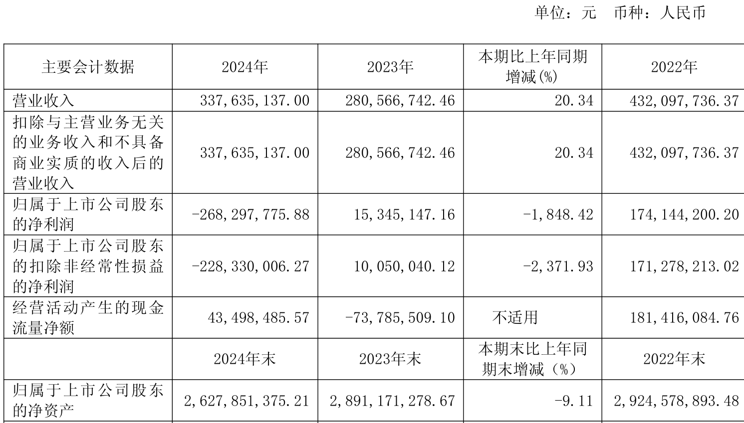 中证智能财讯九鼎投资(600053)4月25日披露2024年年度报告。2024年,公司实现营业总收入3.38亿元,同比增长20.34%;归母净利润亏损2.68亿元,上年同期盈利1534.51万元;扣非净利润亏损2.28亿元,上年同期盈利1005万元;经营活动产生的现金流量净额为4349.85万元,上年同期为-7378.55万元;报告期内,九鼎投资基本每股收益为-0.6189元,加权平均净资产收益率为-9.72%。