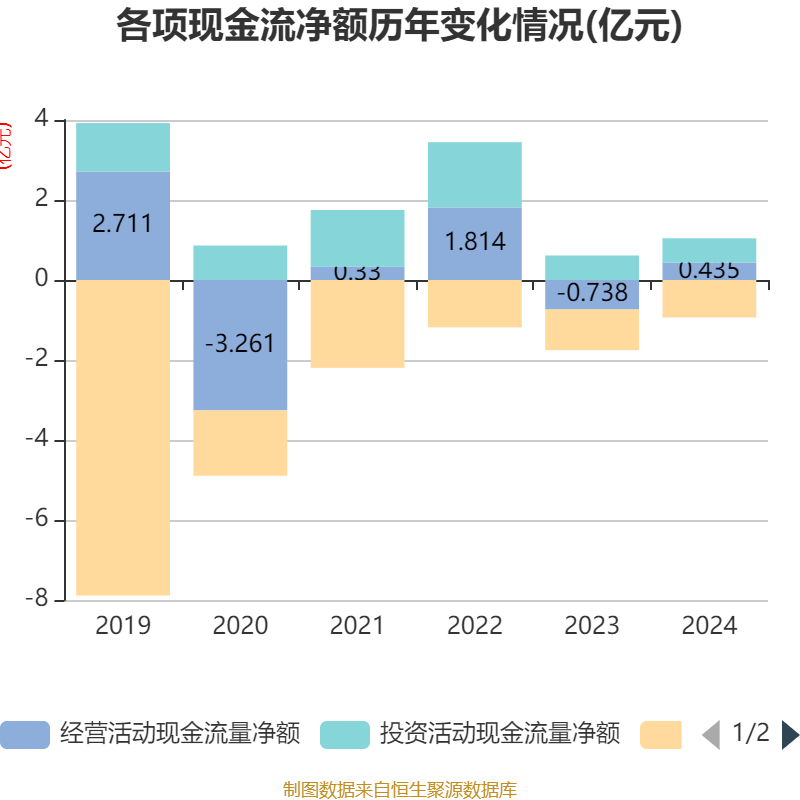 截至2024年,公司经营活动现金流净额为4349.85万元,同比增加1.17亿元;筹资活动现金流净额-9358.68万元,同比增加796.97万元;投资活动现金流净额6073.74万元,上年同期为6134.78万元。