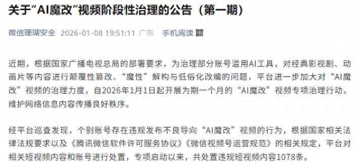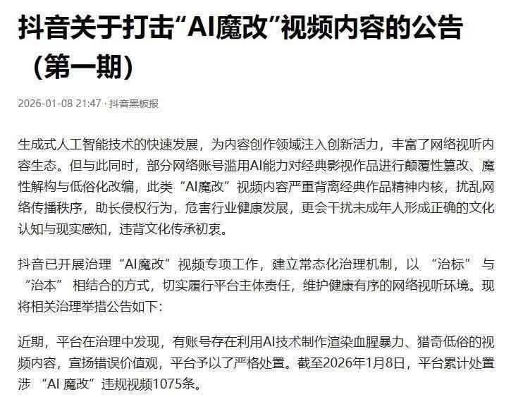 截至2026年1月8日,抖音平台累计处置涉“AI魔改”违规视频1075条。